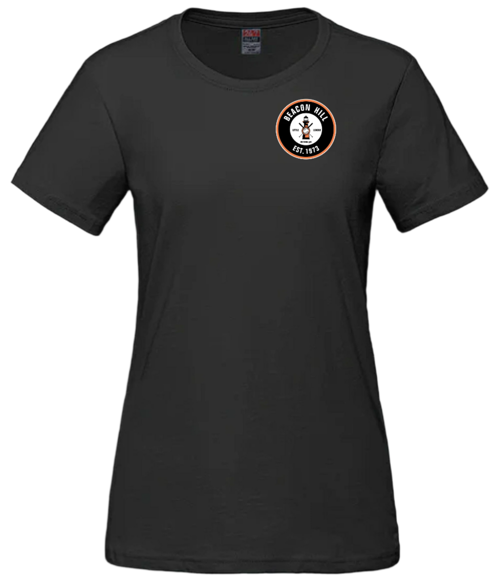 Black Ladies 100% Ring Spun Cotton Tshirt with Screen Printed Full Front Beacon Hill Logo