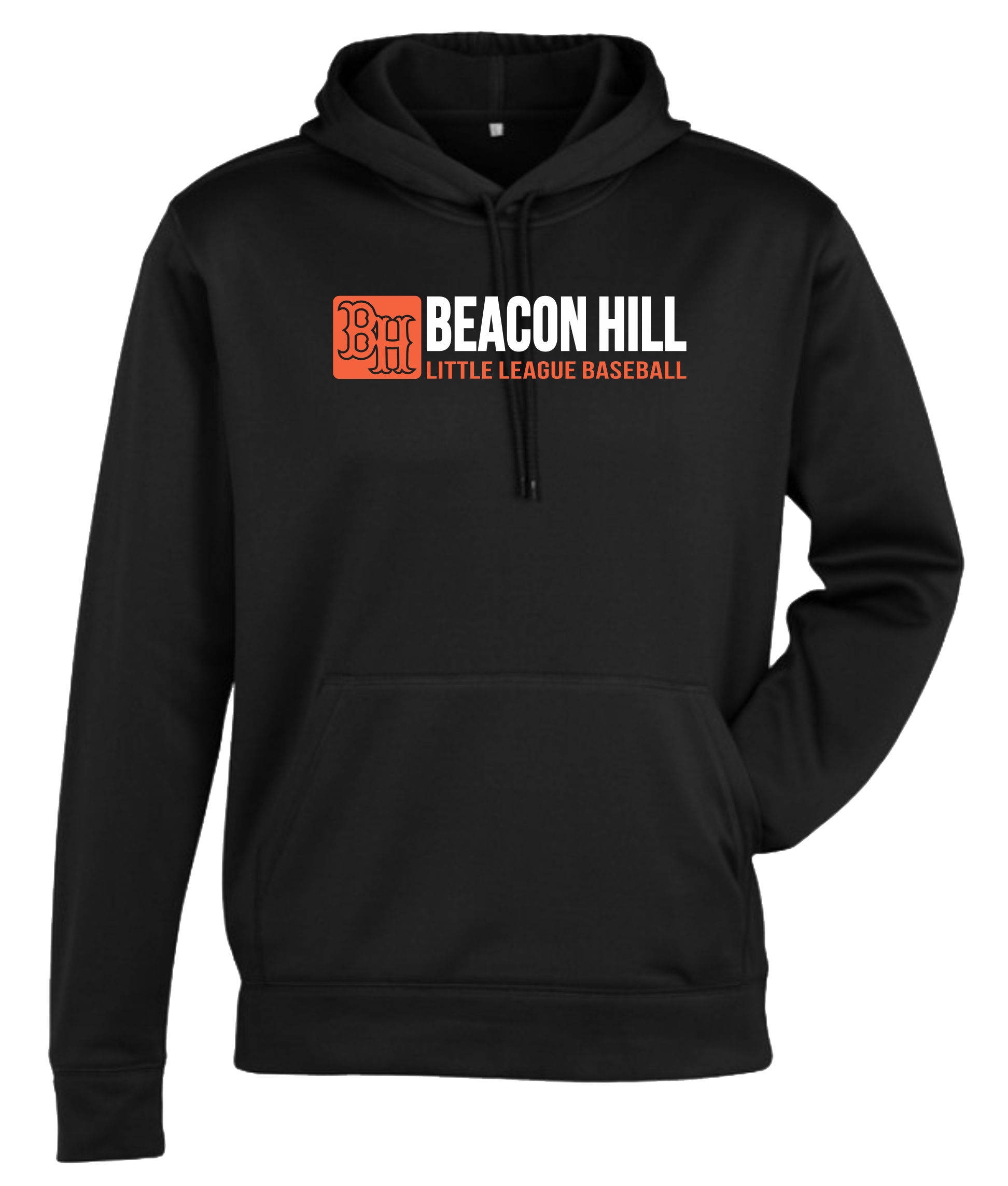 Black Polyester fleece PullOver Unisex and Youth Sized Hoodie with Screen Printed Full Front Beacon Hill BASEBALL Logo.