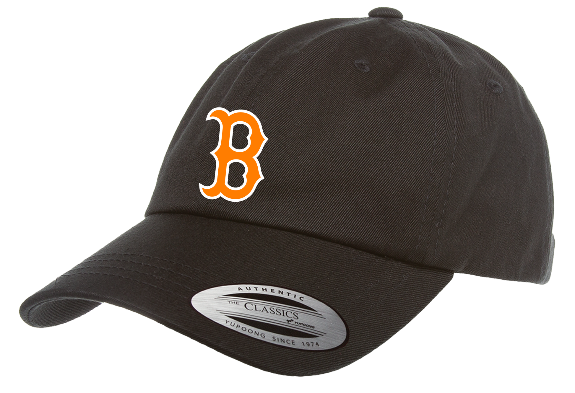 Black Yupoong Classic Dad Hat, 100% cotton chino twill with Embroidery Front and Centre with The 'Puffy' B Beacon Hill Logo