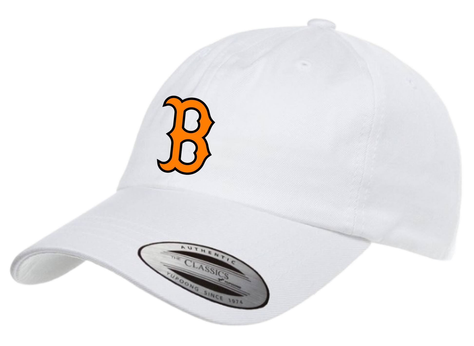 White Yupoong Classic Dad Hat, 100% cotton chino twill with Embroidery Front and Centre with The 'Puffy' B Beacon Hill Logo