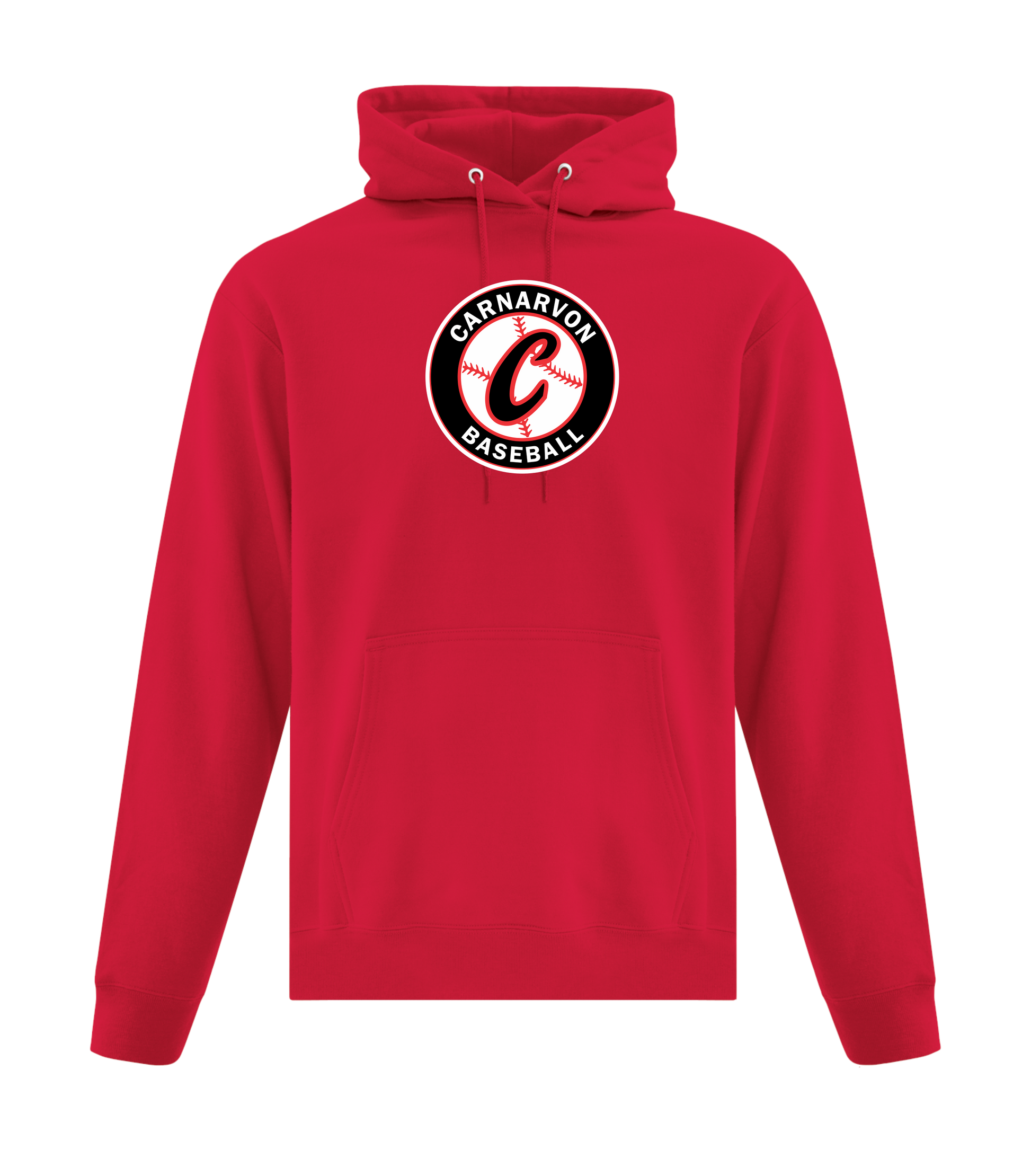 Red ATC Everyday Unisex and Youth Cotton Hoodie with Screen Printed Full Front Carnarvon Baseball Logo