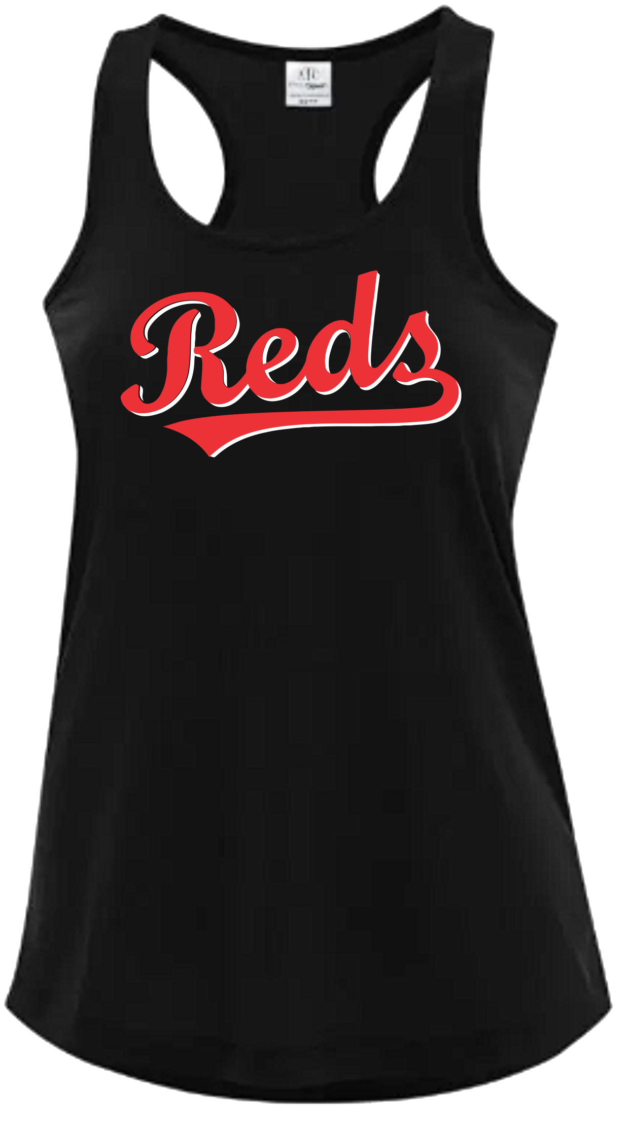 Polyester Ladies Racer Back Black Tank Top with Screen Printed Full Front Carnarvon Reds Logo.