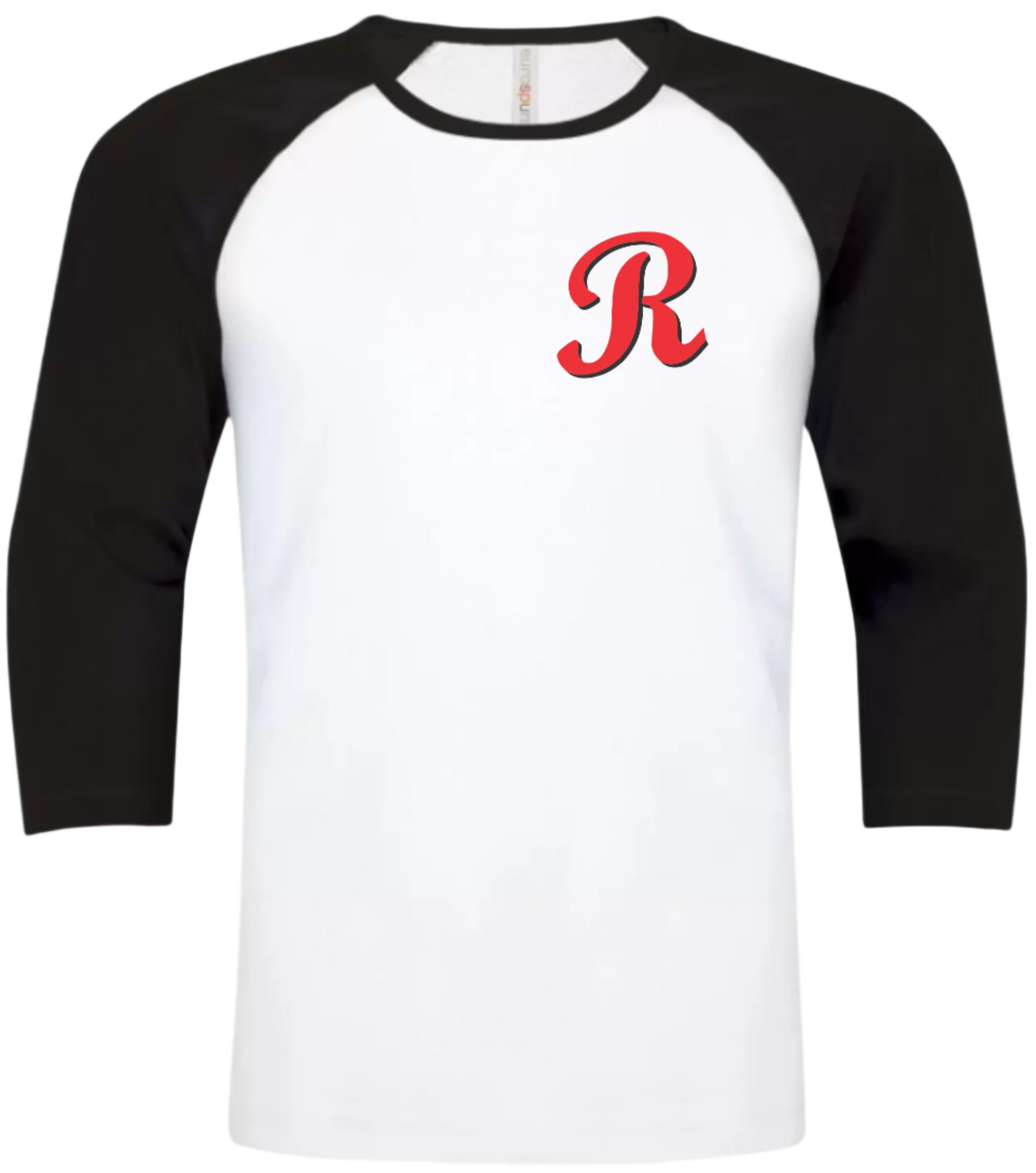 Black Arm, White Body 3/4 Sleeve Baseball Cotton Tshirt Unisex and Youth Size with Screen Printed Full Front Carnarvon Reds Logo.