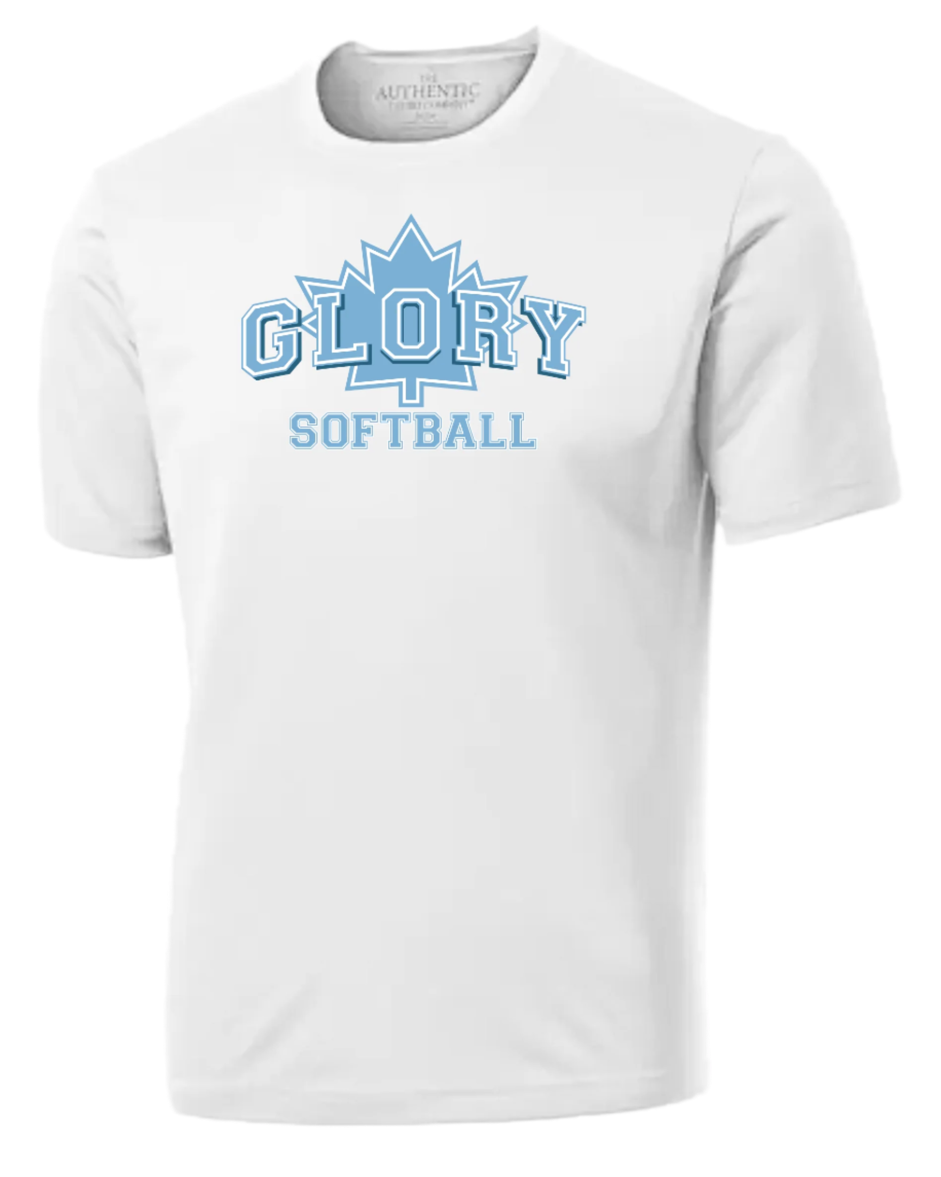 White ATC Pro Team Youth and Unisex Short Sleeve DriFit Tshirt with Screen Printed Full Front Glory Softball Logo