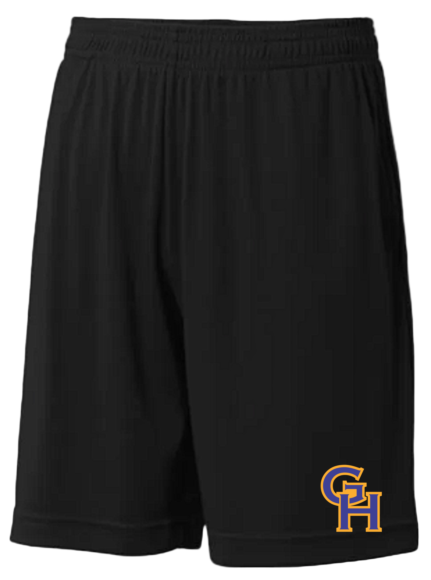 Black Pro Team Polyester Unisex and Youth Pocketed Shorts with Screen Printed Left Leg Gordon Head Baseball 'GH' Logo