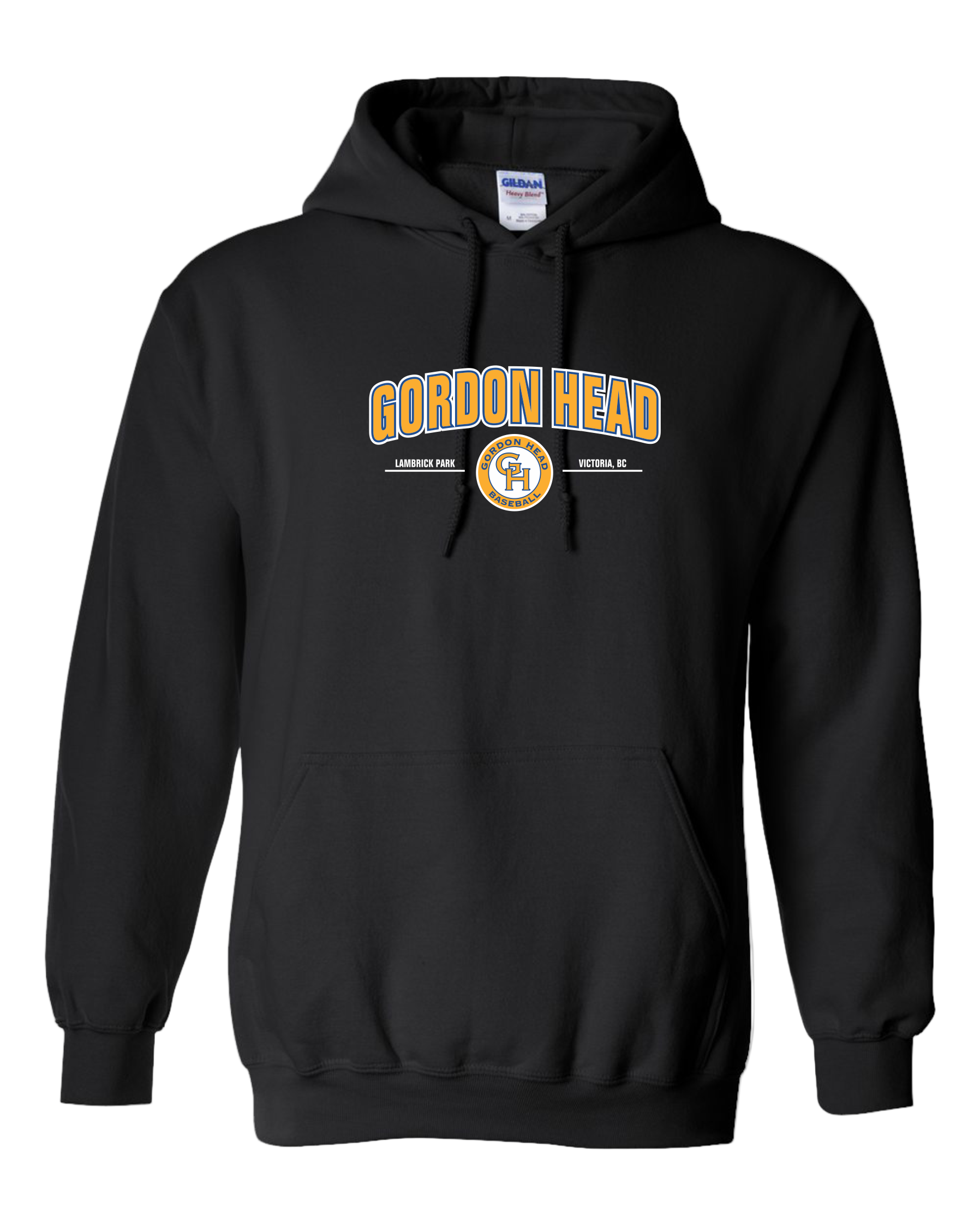 50/50 Unisex and Youth Black Pullover Hoodie with Screen Printed Gordon Head Baseball Logo.