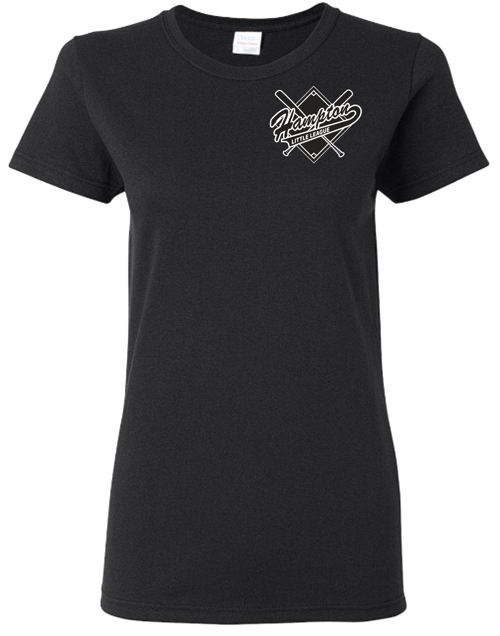 Black Ladies Gildan Cotton Tshirt with Screen Printed Left Chest Crossed Bats Logo.