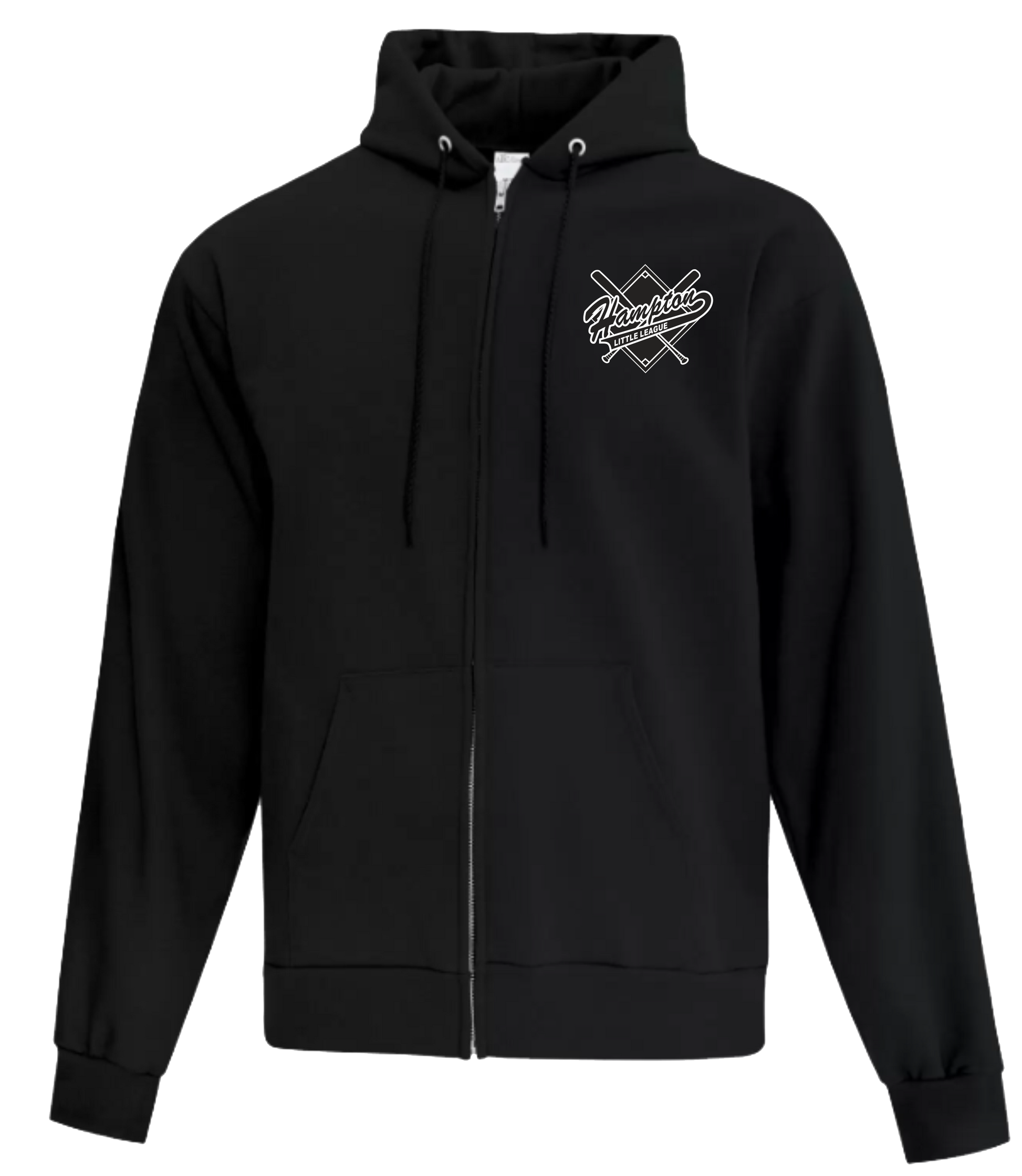 50/50 Unisex and Youth Black Full Zip Hoodie with Screen Printed Left Chest Hampton Little League Crossed Bats Logo.