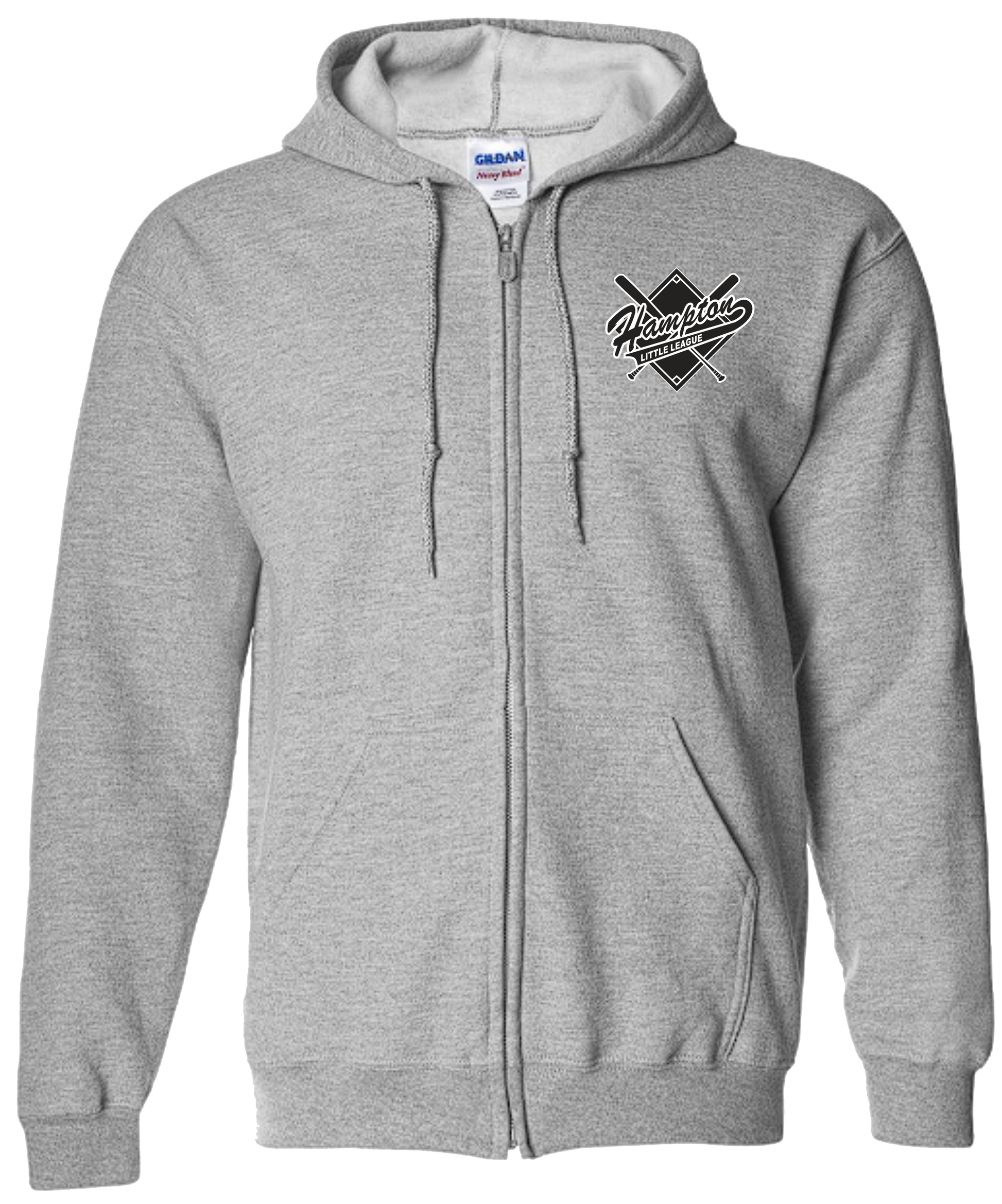 50/50 Unisex and Youth Sport Grey Full Zip Hoodie with Screen Printed Left Chest Hampton Little League Crossed Bats Logo.