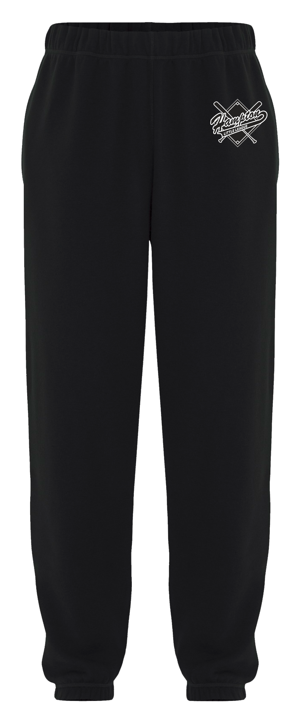 Black Unisex and Youth Cotton Sweatpants with Screen Printed Left Leg Hampton Little League Crossed Bats Logo.