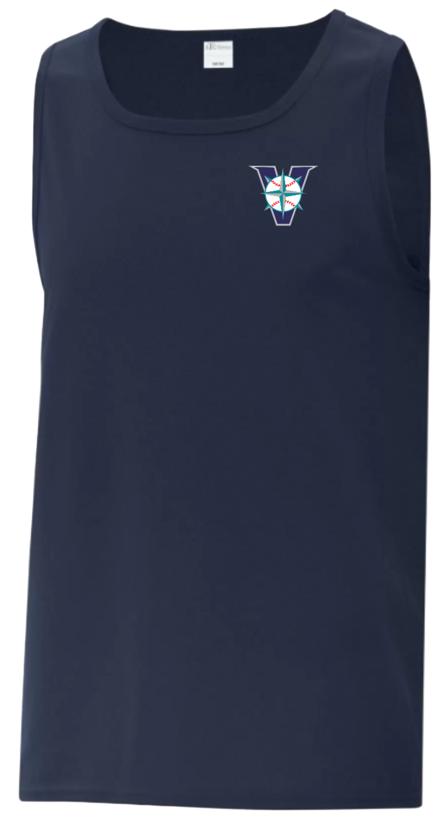Navy Men's Tank Top with Screen Printed Left Chest Victoria Mariners Baseball Club 'V' Logo.
