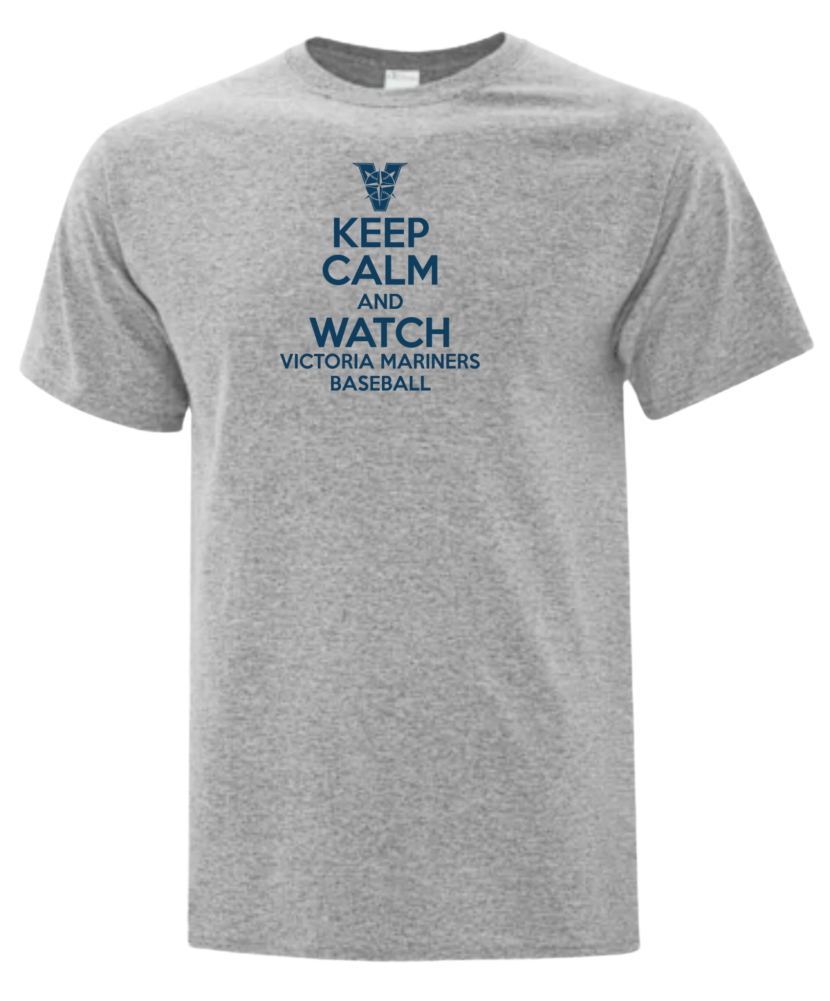 100% Cotton Tshirt Short Sleeve Unisex and Youth DriFit Tshirt with Screen Printed Full Front Victoria Mariners 'KEEP CALM' Logo.
