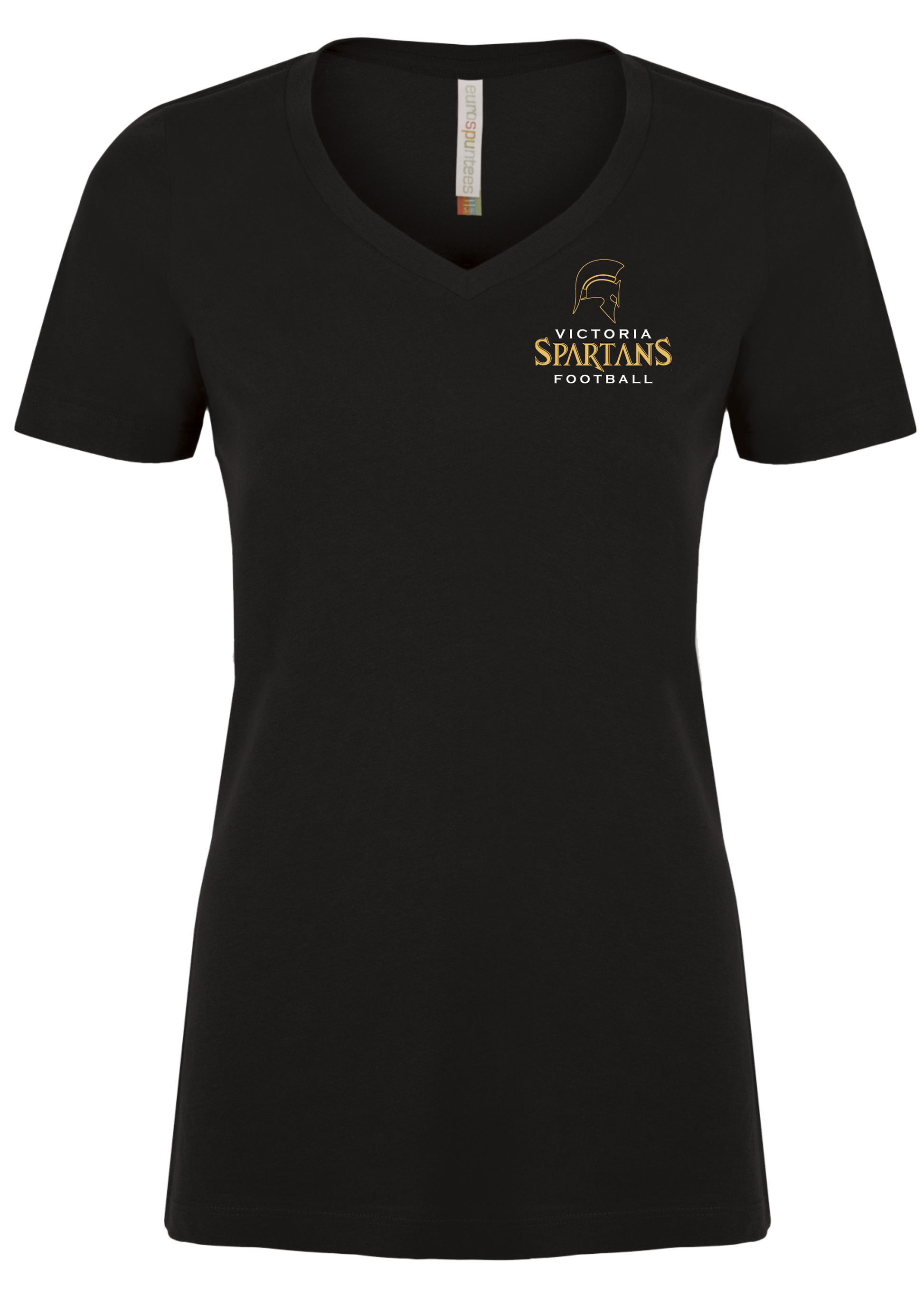 Ladies 100% Cotton Black VNeck Tshirt with Screen Printed Left Chest Victoria Spartans Football Logo