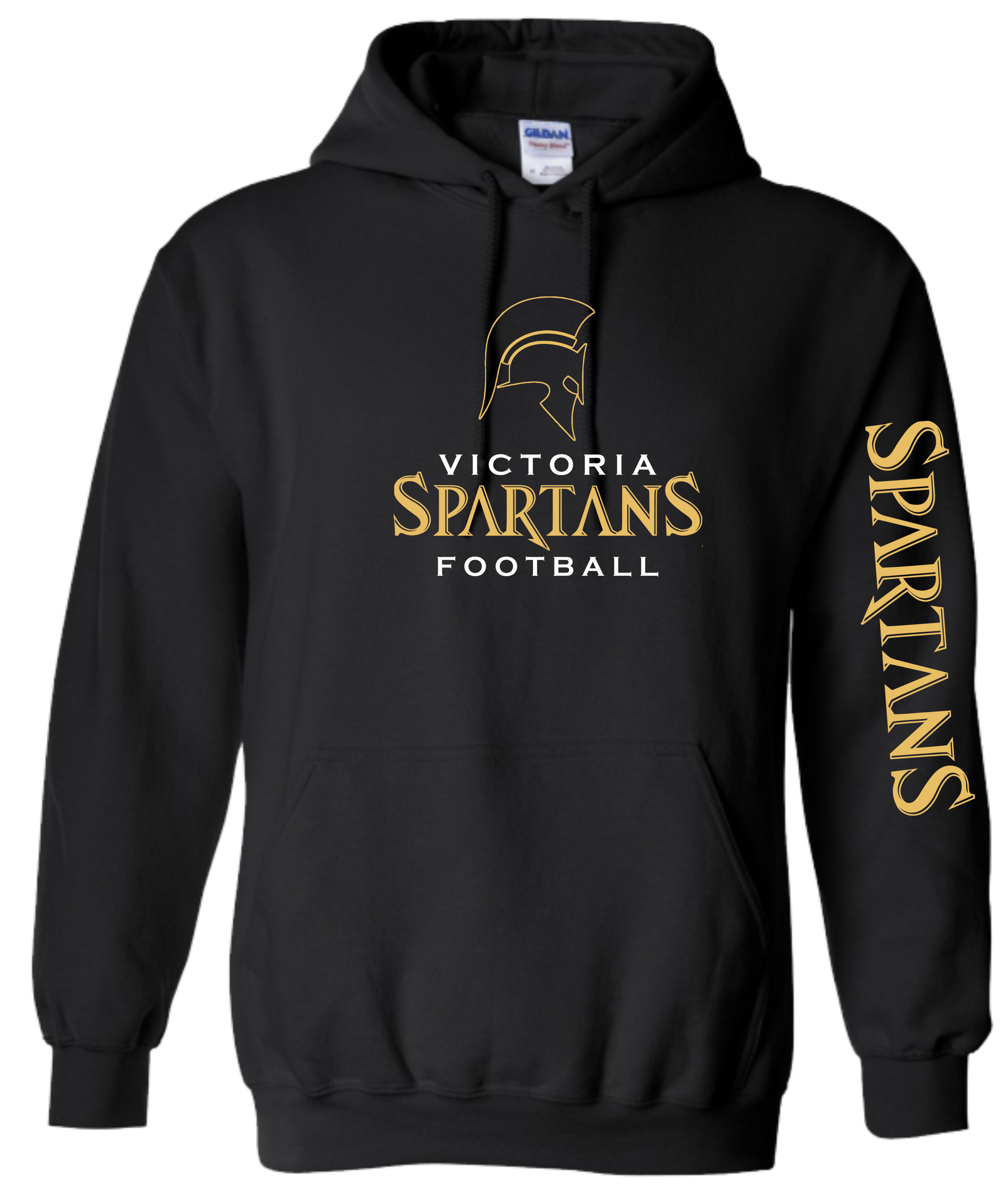 Unisex and Youth Cotton Hoodie with Screen Printed Full Front Victoria Spartans Football Logo and Left Arm Logo.